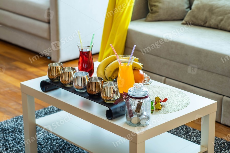 Romantic compositiom with drinks and fruits on the table. Blurred background.