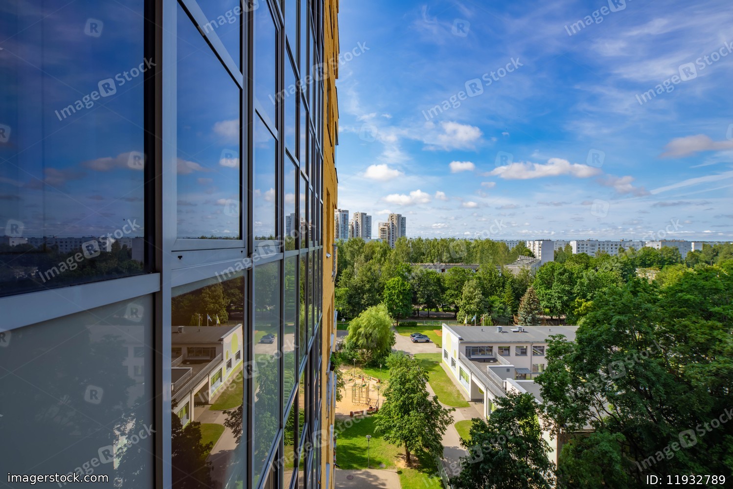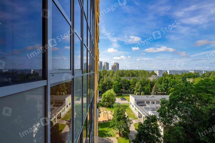 Sunny summer cityscape. Green trees. Modern exterior of office building.