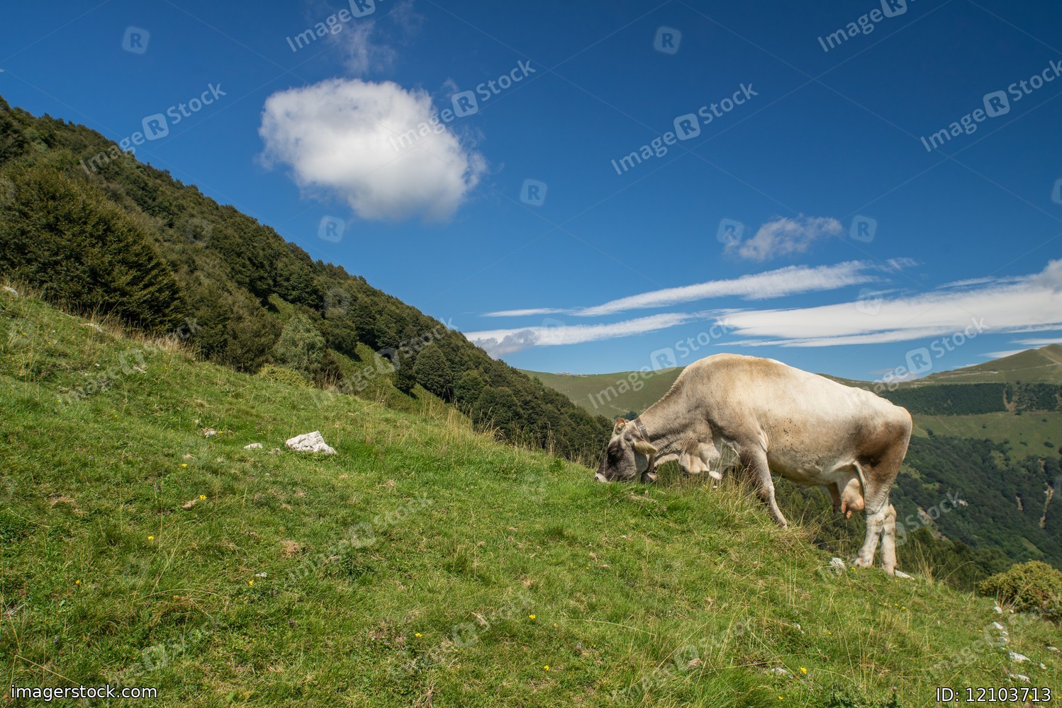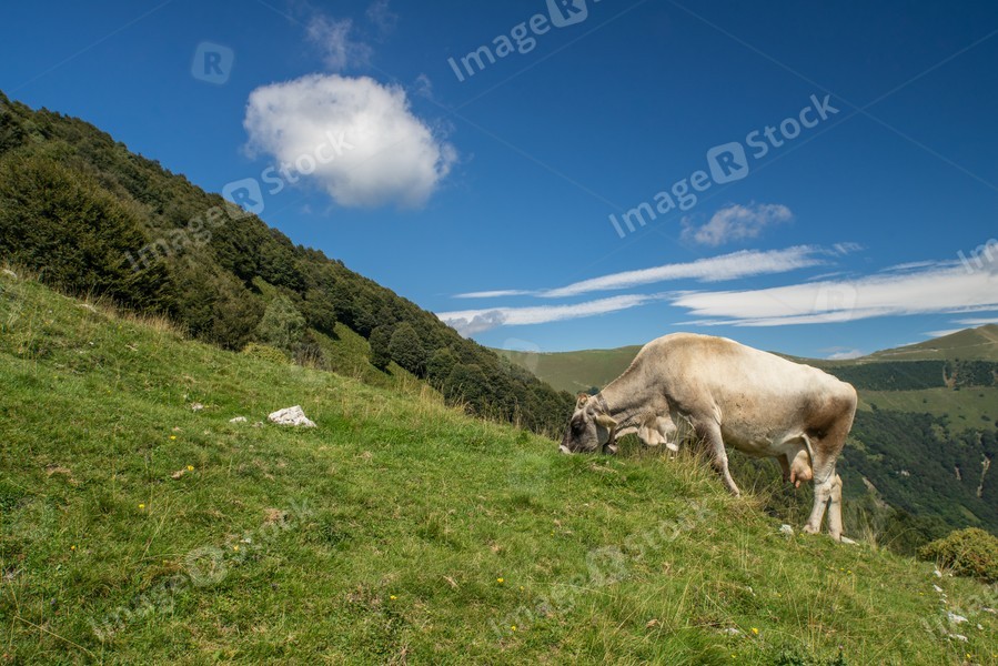The pasture in the mountains. Cows grazing on the hills. Italy.
