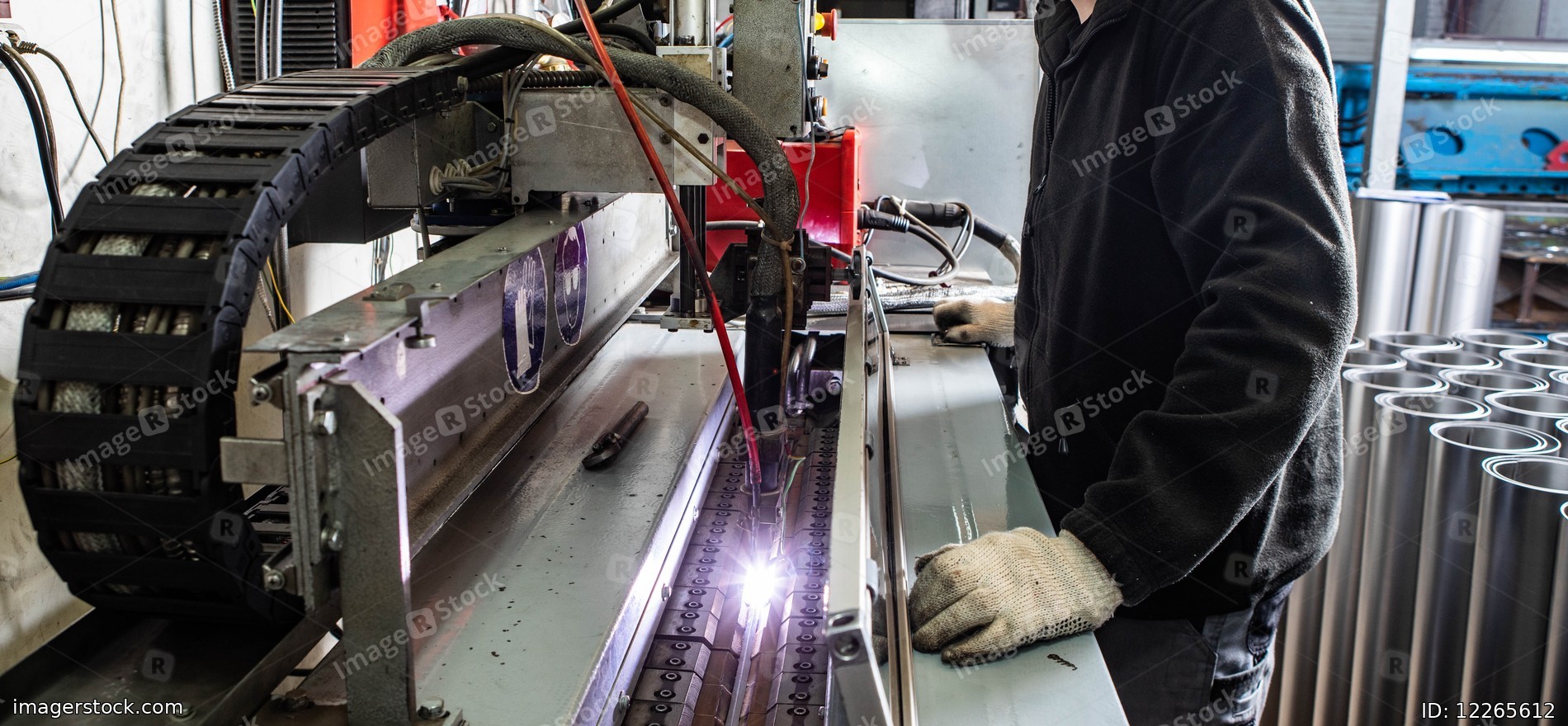 Working overlap arc welding machine. Welded seam. Welding sparks.