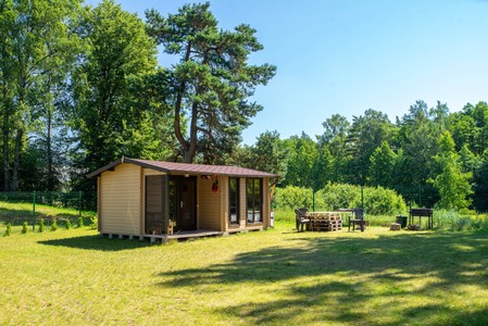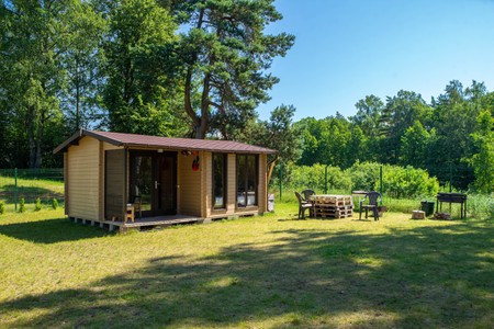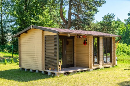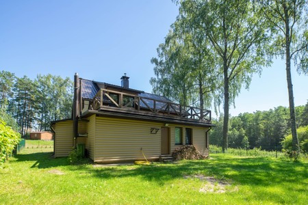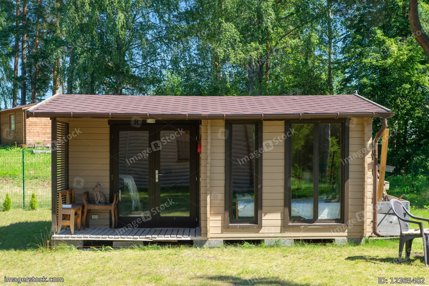 Small new summer house on the private territory near the green forest. Sunny summer day. Beautiful nature. Resting cat Sphinx.