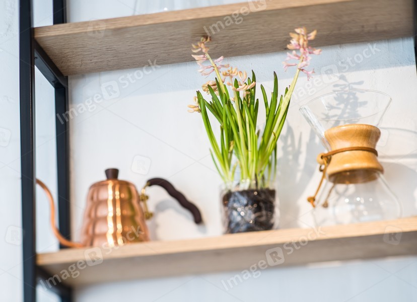 Interior decor, kitchen accessories, bottles, kettle.