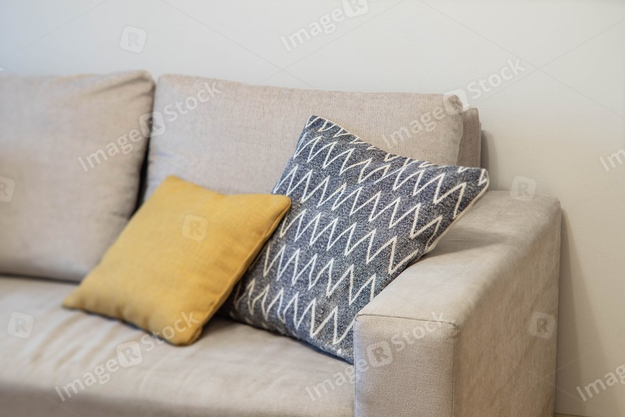 Close-up of pillows on cozy grey sofa. Soft cushion. Modern interior of living room.
