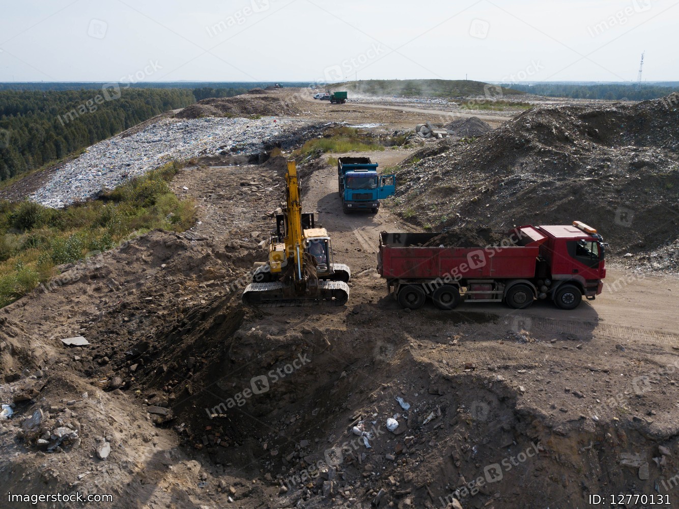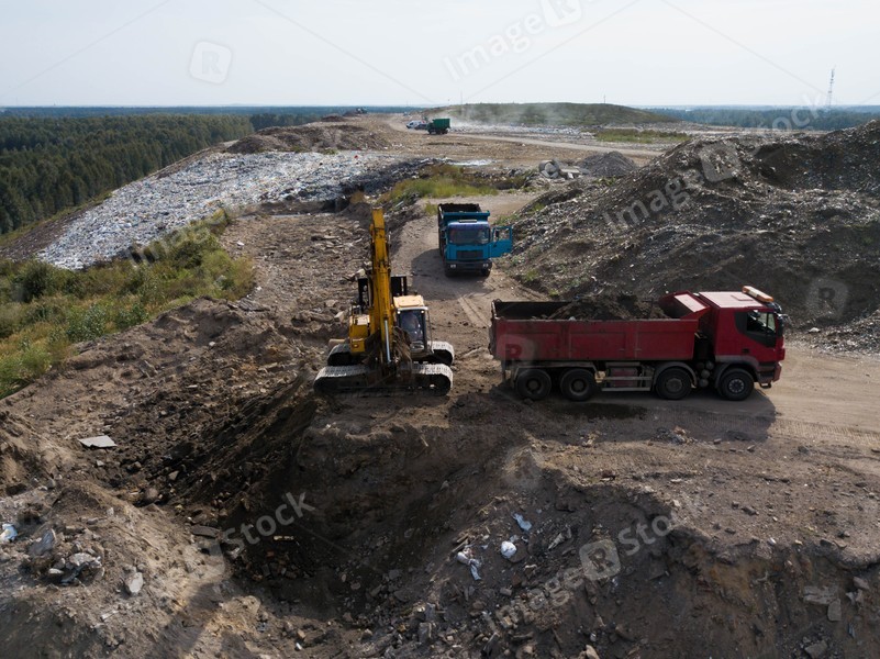Digger and trucks on excavation pit. Stony soil. Heap of sand. Construction site. Heavy equipment.