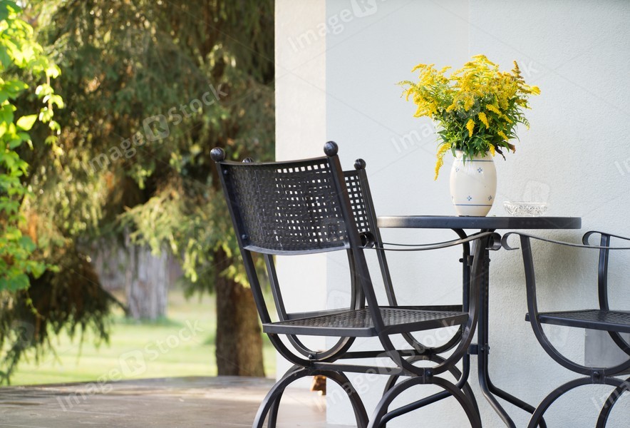 Black chairs and table outside. White wall. Vase with flowers.