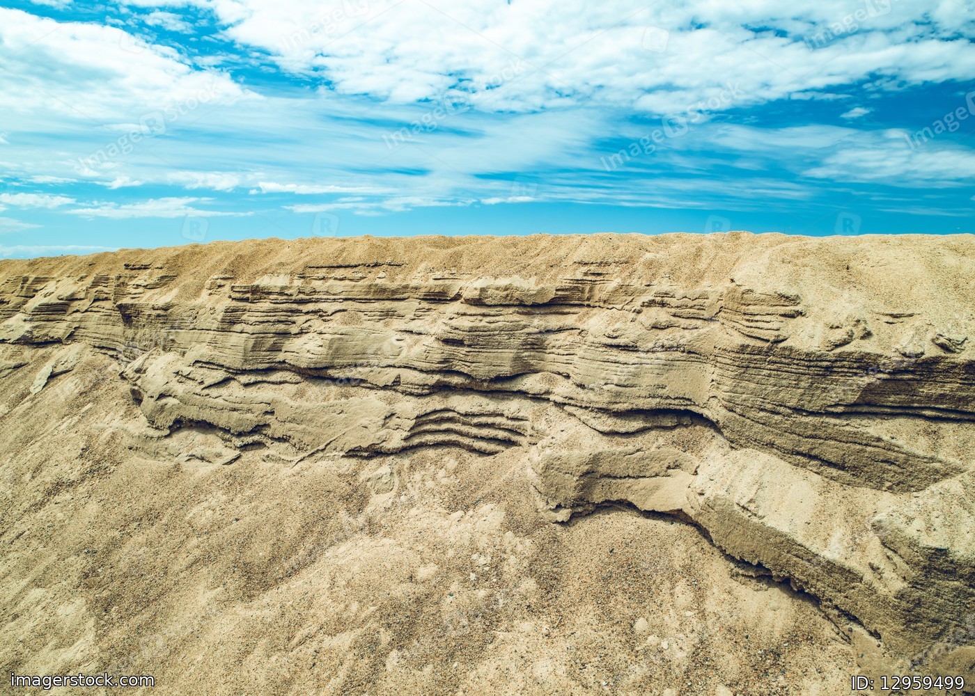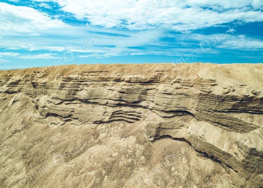 Scenic landscape. Sandy shore. Sand rock. Cloudy sky