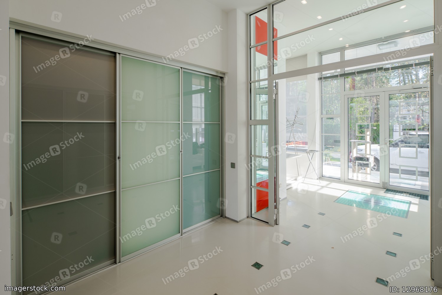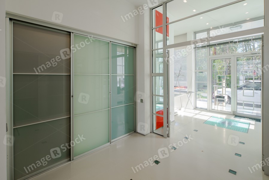 Modern interior of hall in luxury private house. Glass sliding doors.