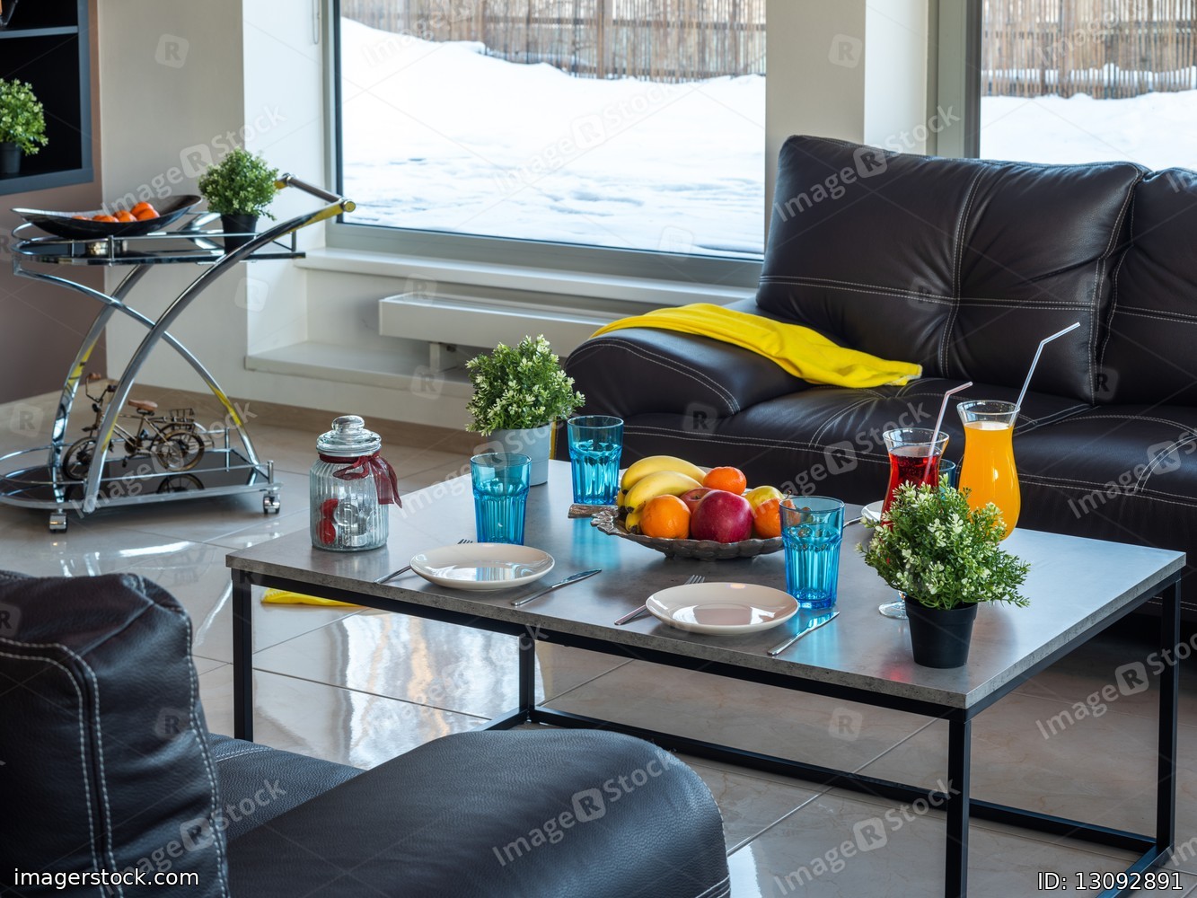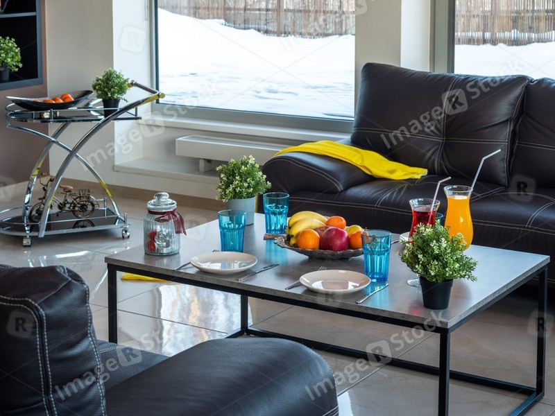 Close-up of table. Leather sofas. Plates and glasses. Fruits on plate.