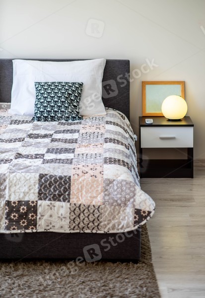 Modern interior of bedroom. Bed with pillows and blanket. Bedside with round lamp.