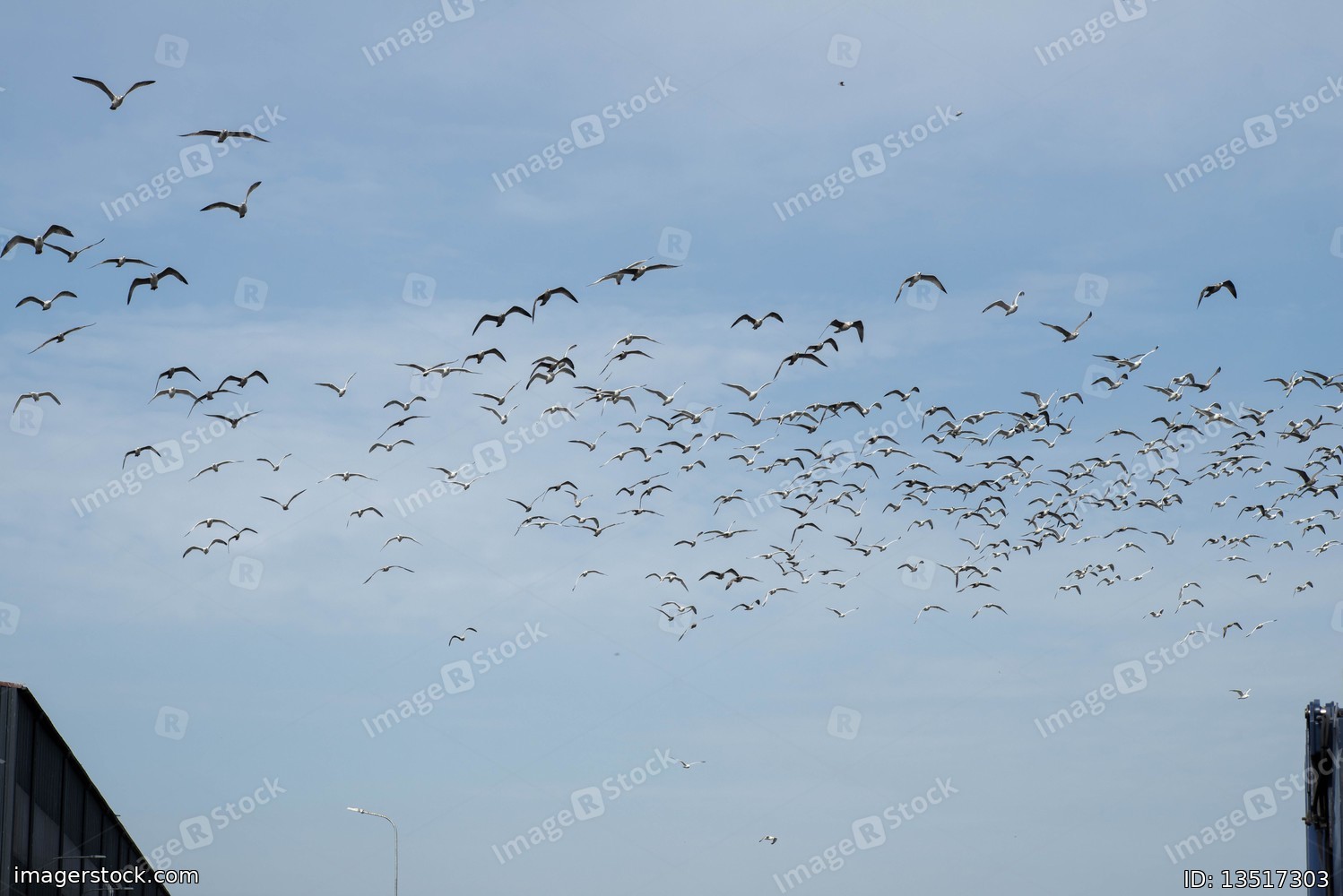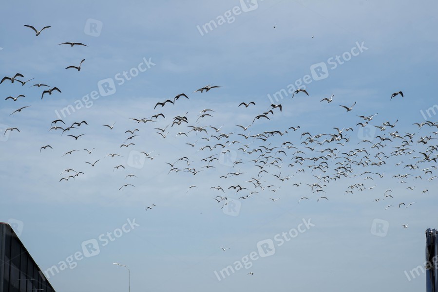 Flock of gulls flying in the air. Blue sky. White birds.
