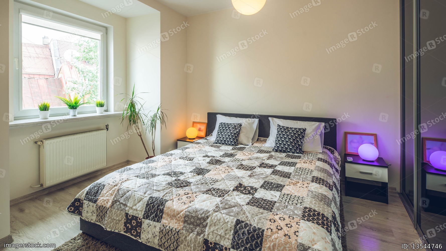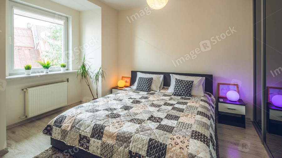 Modern interior of bedroom. Bed with pillows and blanket. Bedsides with round lamps.