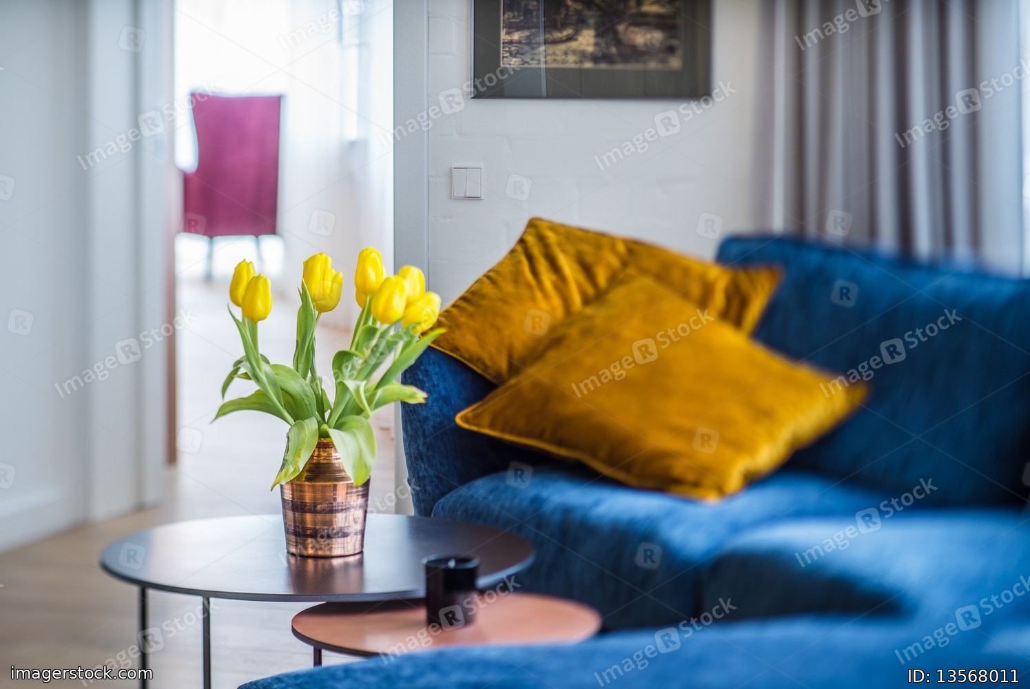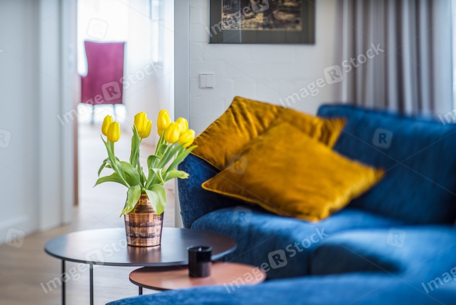 Interior of a modern apartment. Interior design, yellow tulips in a vase on the table.