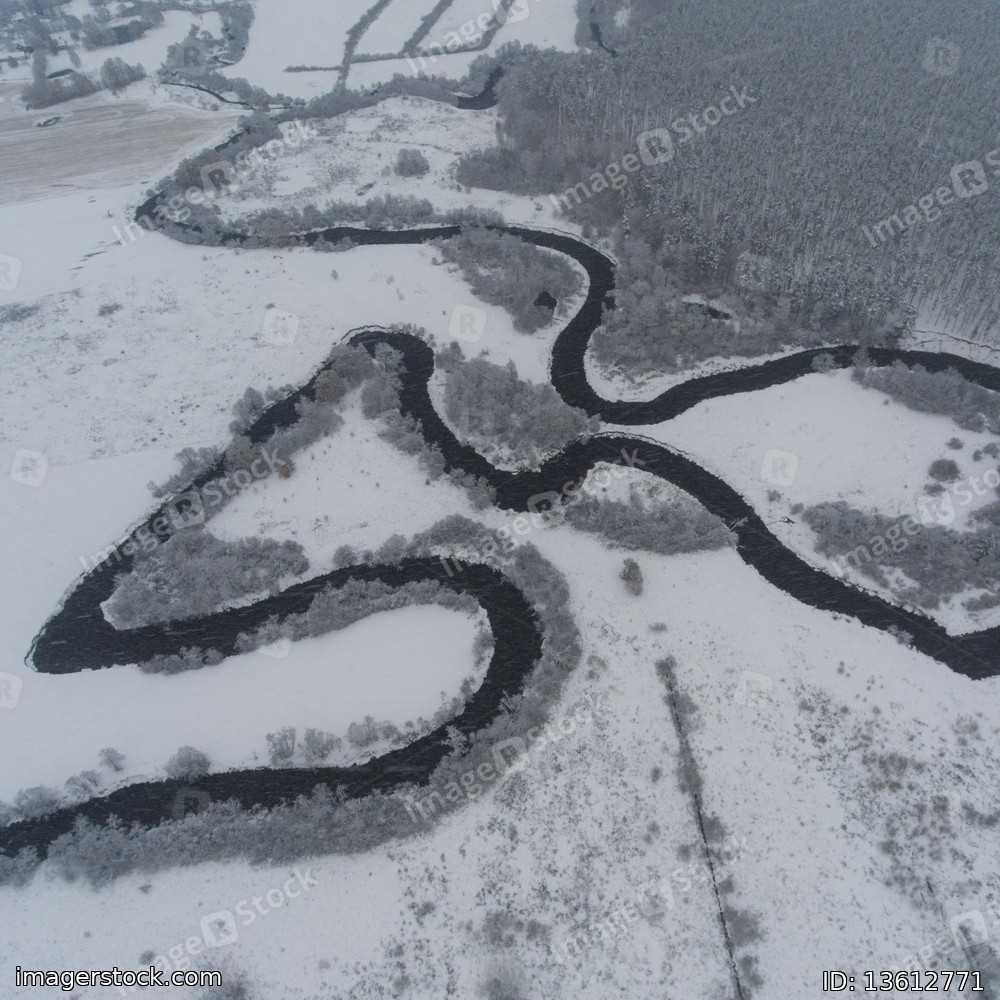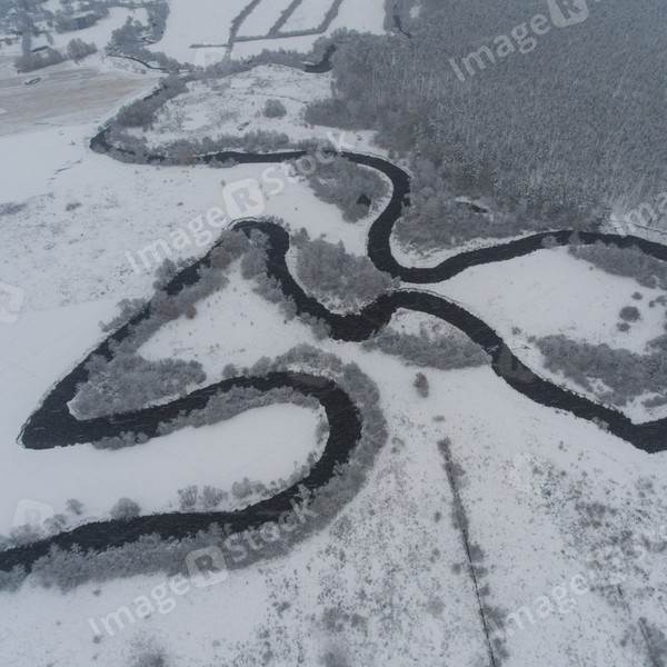 Top drone view of curved river. Scenic winter landscape. Forest and field covered by snow.