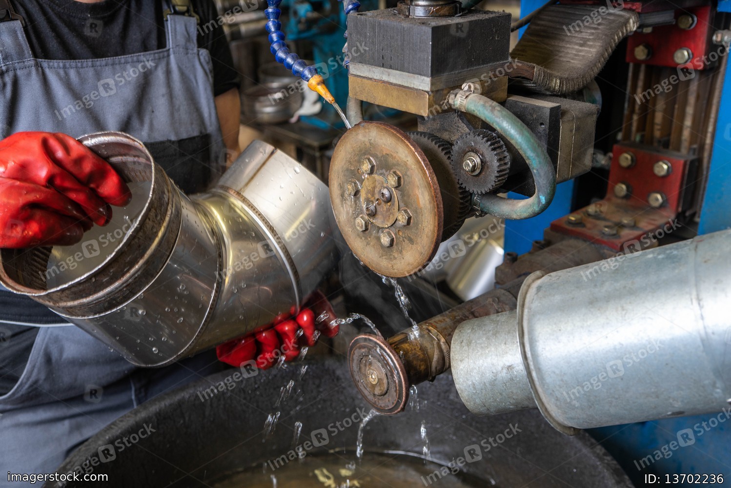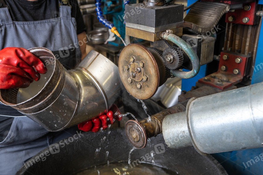 Worker at factory. Welding in a circle. Water cooling. Machine for spot welding of pipes.