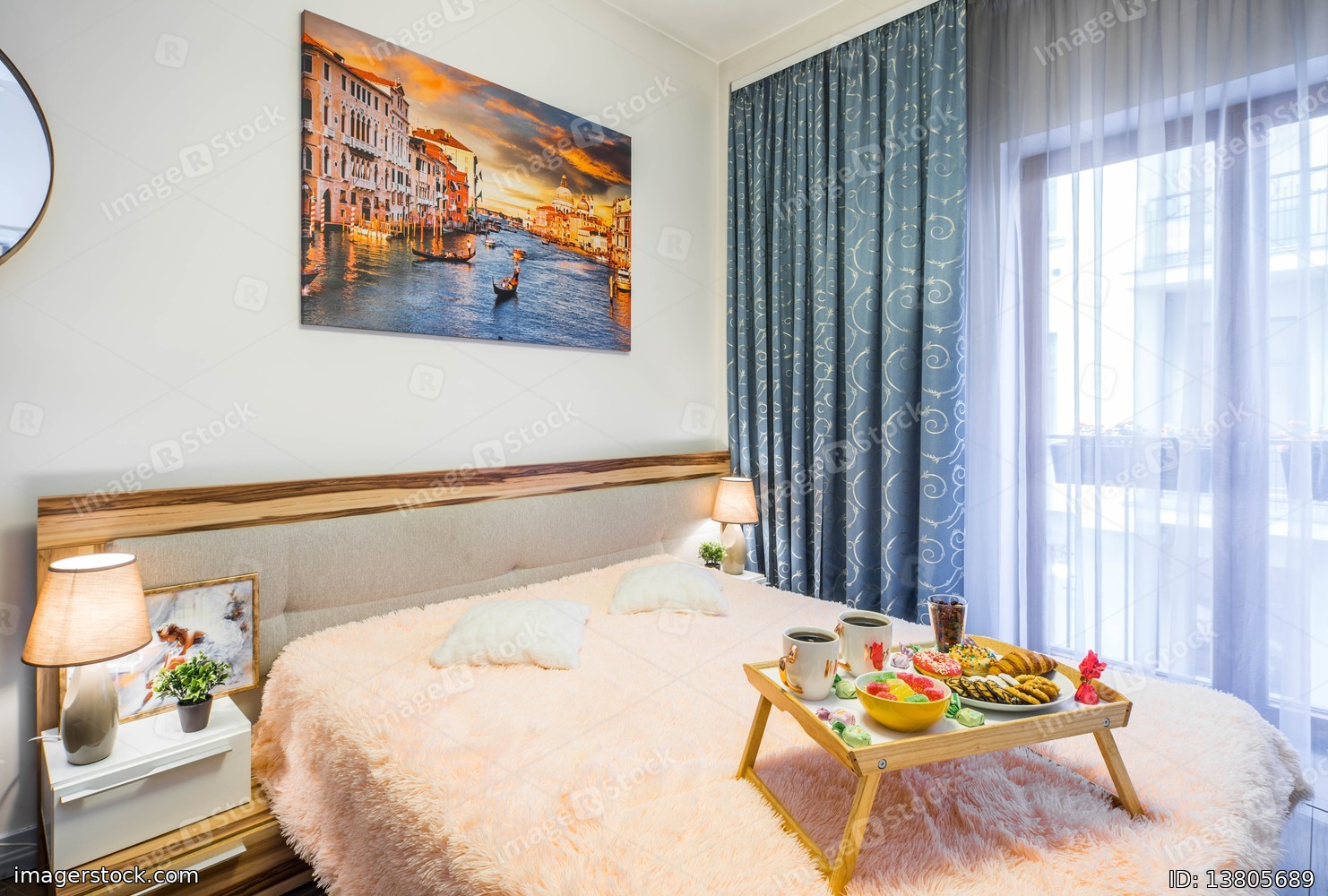 Modern interior of spacious bedroom with furniture and decor.