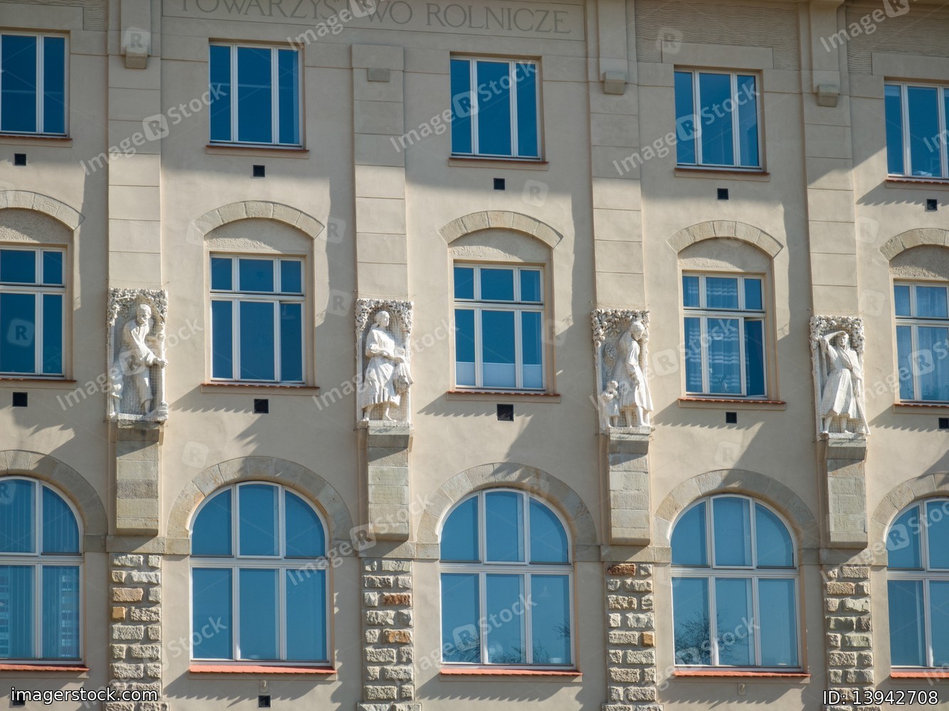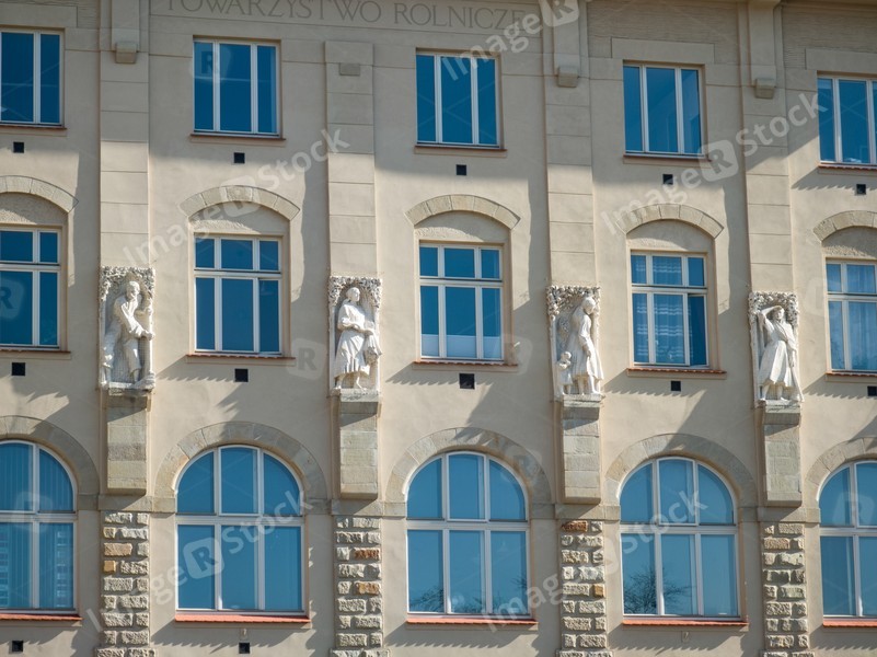 Facade of modern building in Krakow, Poland. Tourism in Europe.