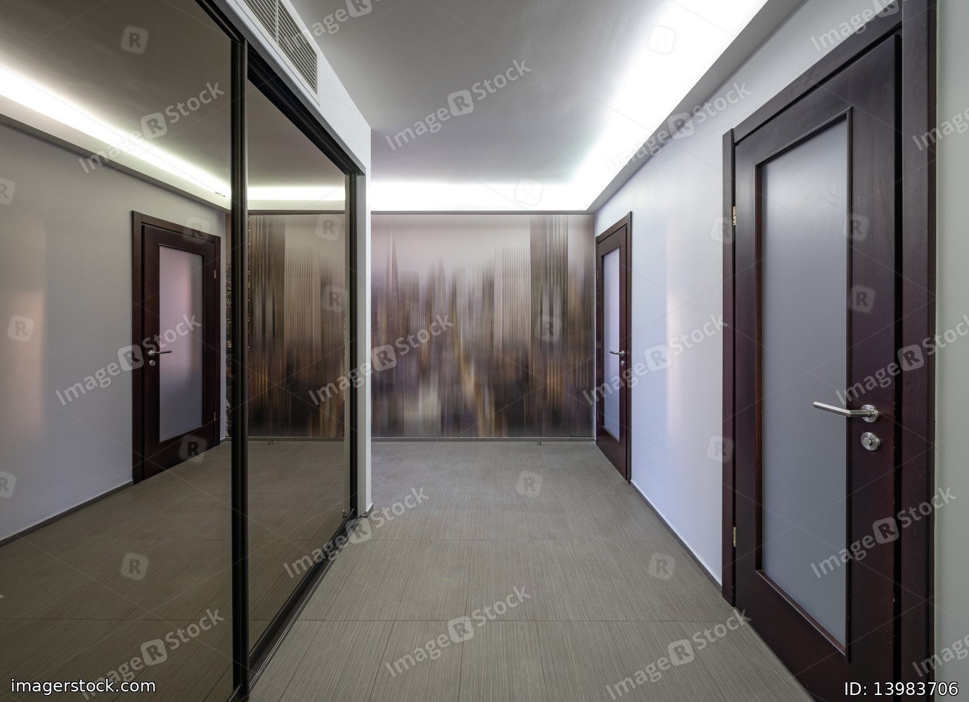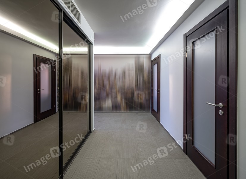 Modern interior of entrance hall in house. Mirror sliding door wardrobe.