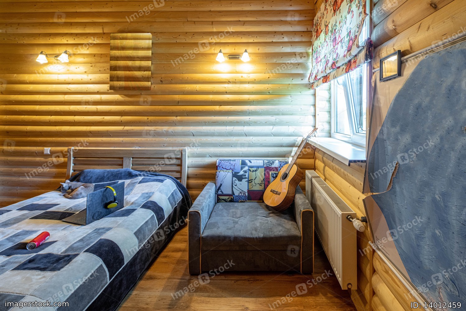 Eco wooden interior of attic bedroom in private country house. Soft cozy bed. Cat Sphinx. Guitar on the chair.
