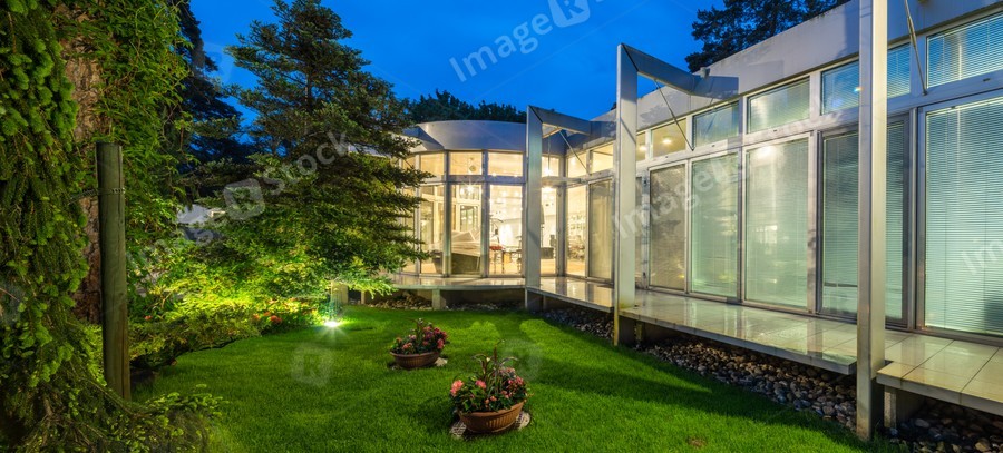 Modern exterior of luxury private house at twilight. Beautiful garden.