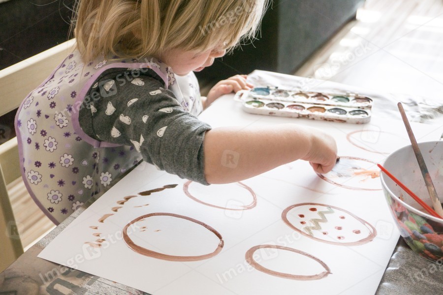 Little girl draws and decorates Easter eggs with water colors
