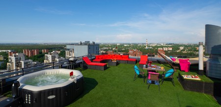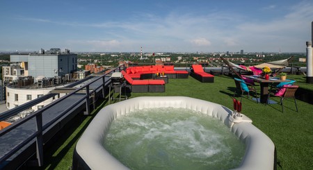 Relaxing zone on the rooftop with furniture and jacuzzi. Veiw of city from the top.