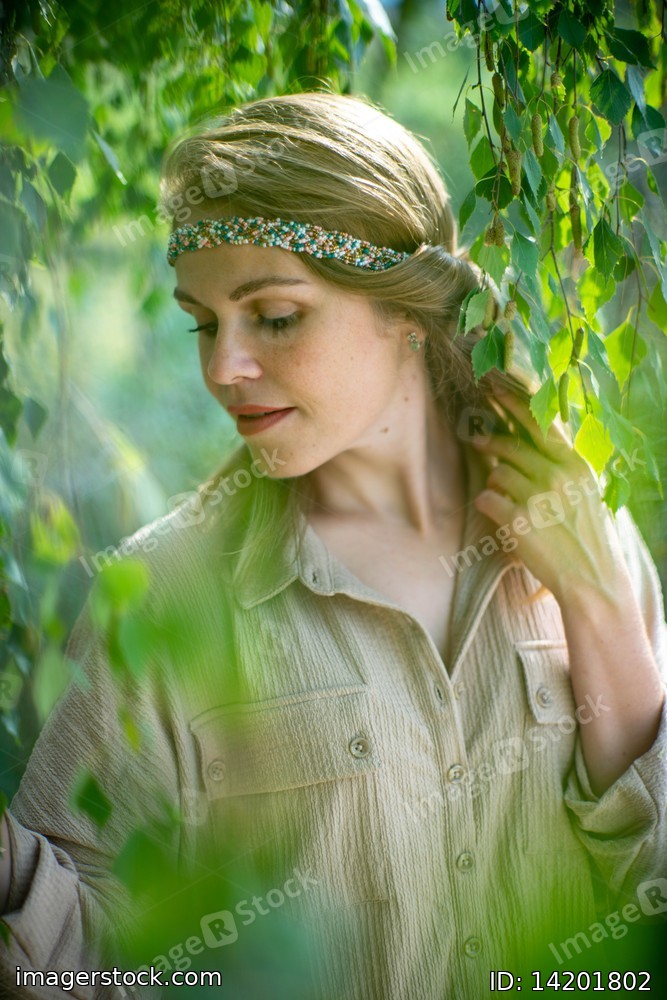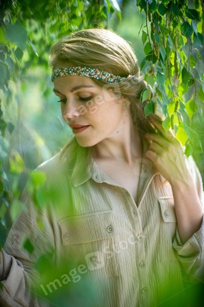 Beautiful woman. Green leaves. Portrait.