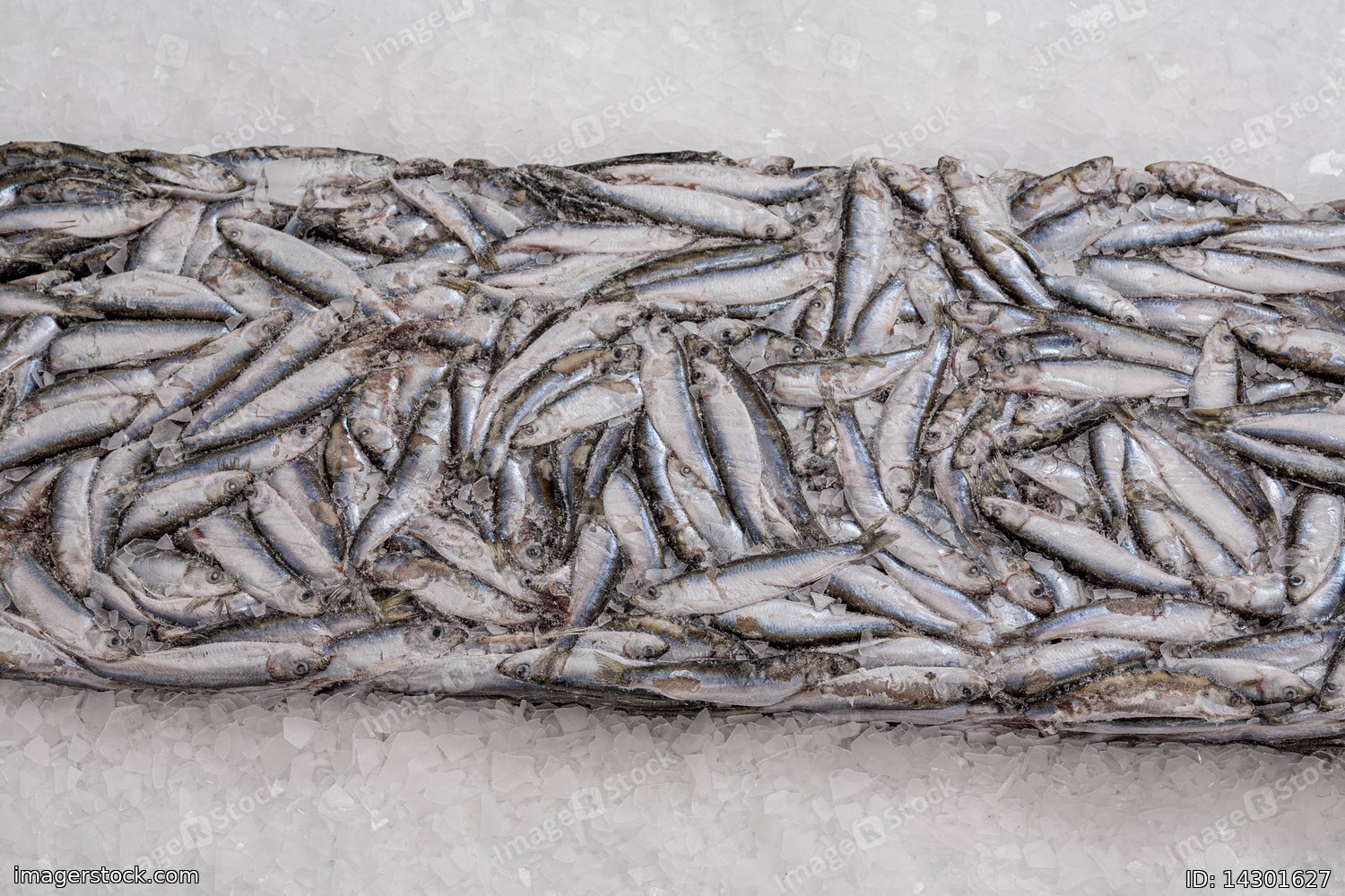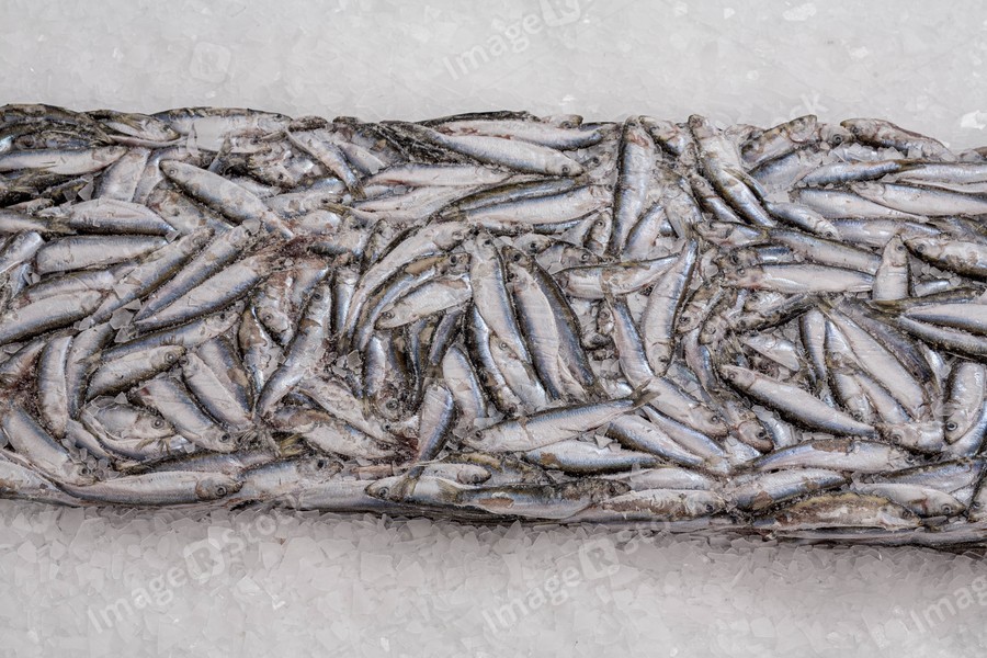 Close-up of sprat brick on the ice in fish market. Winter fishing. Frozen small silver fish. Pieces of ice.