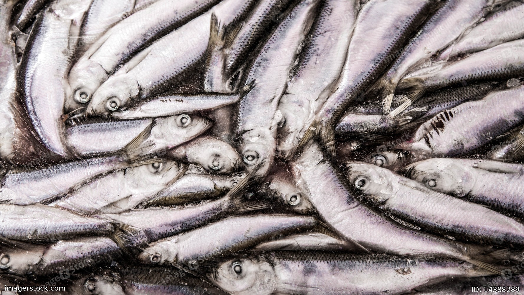 Close-up of frozen sprat in fish market. Winter fishing. Small silver fish production.