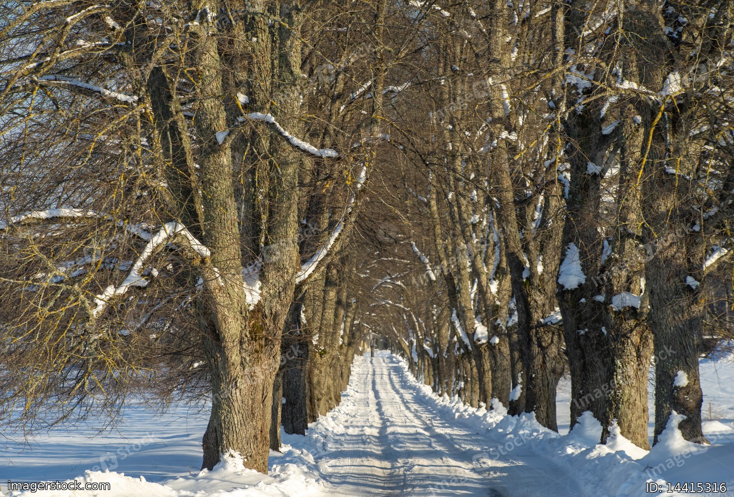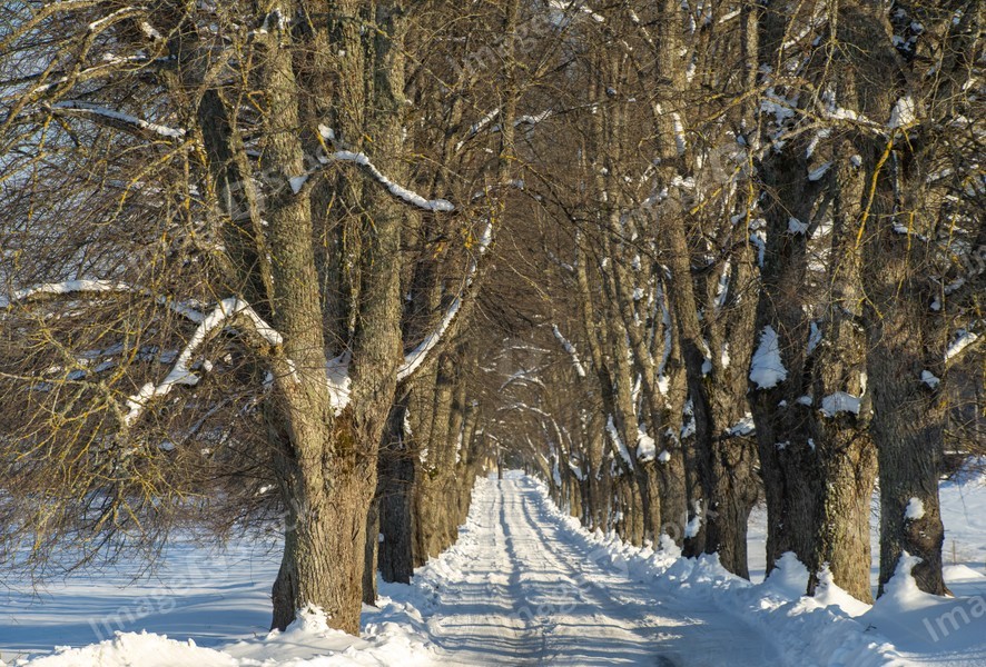Scenic winter landscape at sunny day. Snow-covered alley between trees