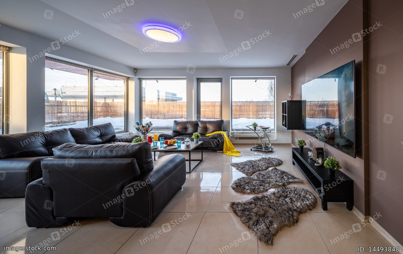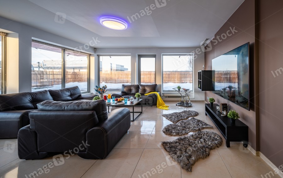 Modern interior of spacious living room in luxury private house. Black leather furniture