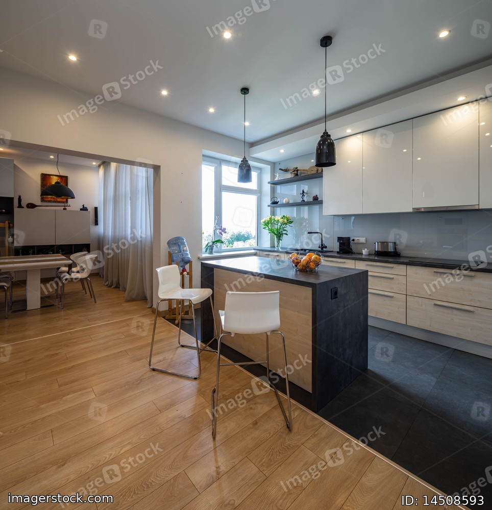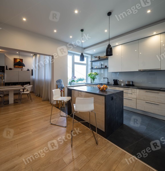 Modern interior of kitchen in luxury apartment. White cabinets. Wooden kitchen set with sink. Table and chairs. Living room.