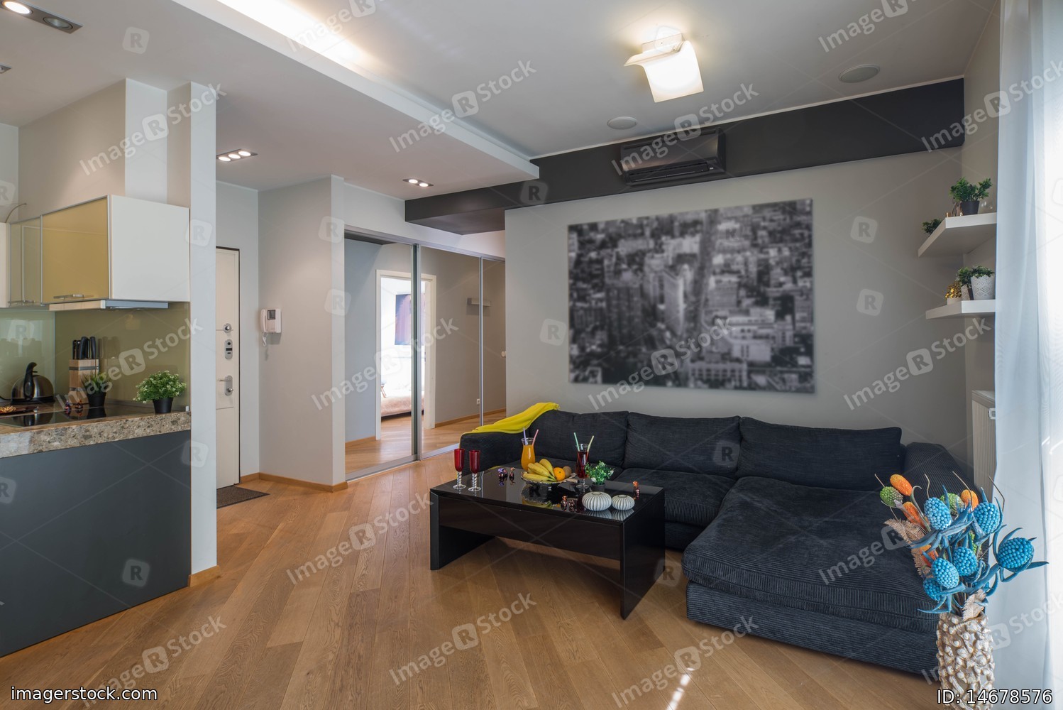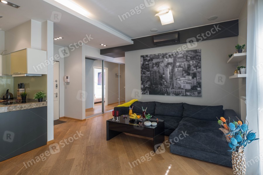 Cozy sofa. Living room. Small table with food and drinks. Entrance hall.