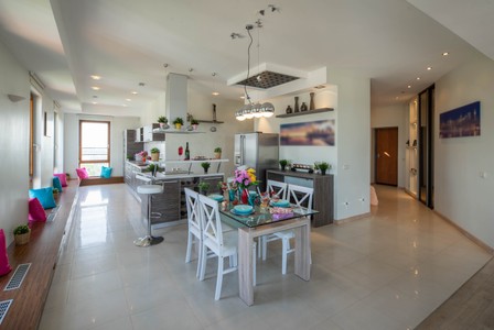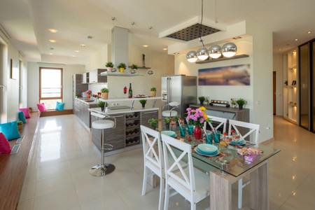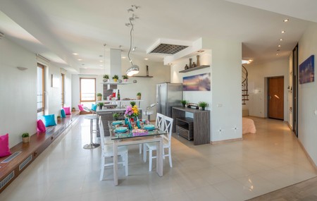 Contemporary interior of country private house. Green walls. Set table in living room. Wooden door. Cozy sofa.