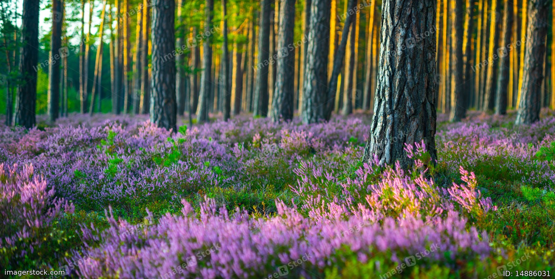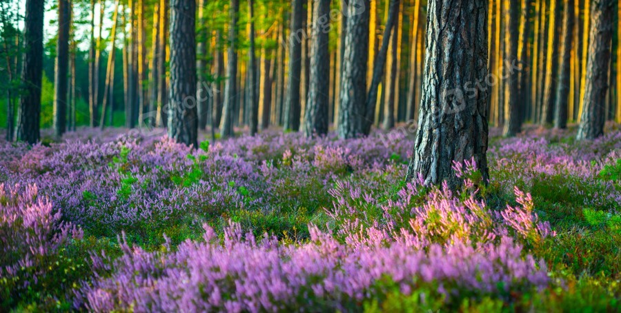 Sunny day. Blooming heather. Beautiful lawn in the forest.