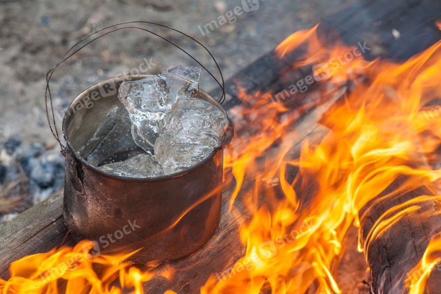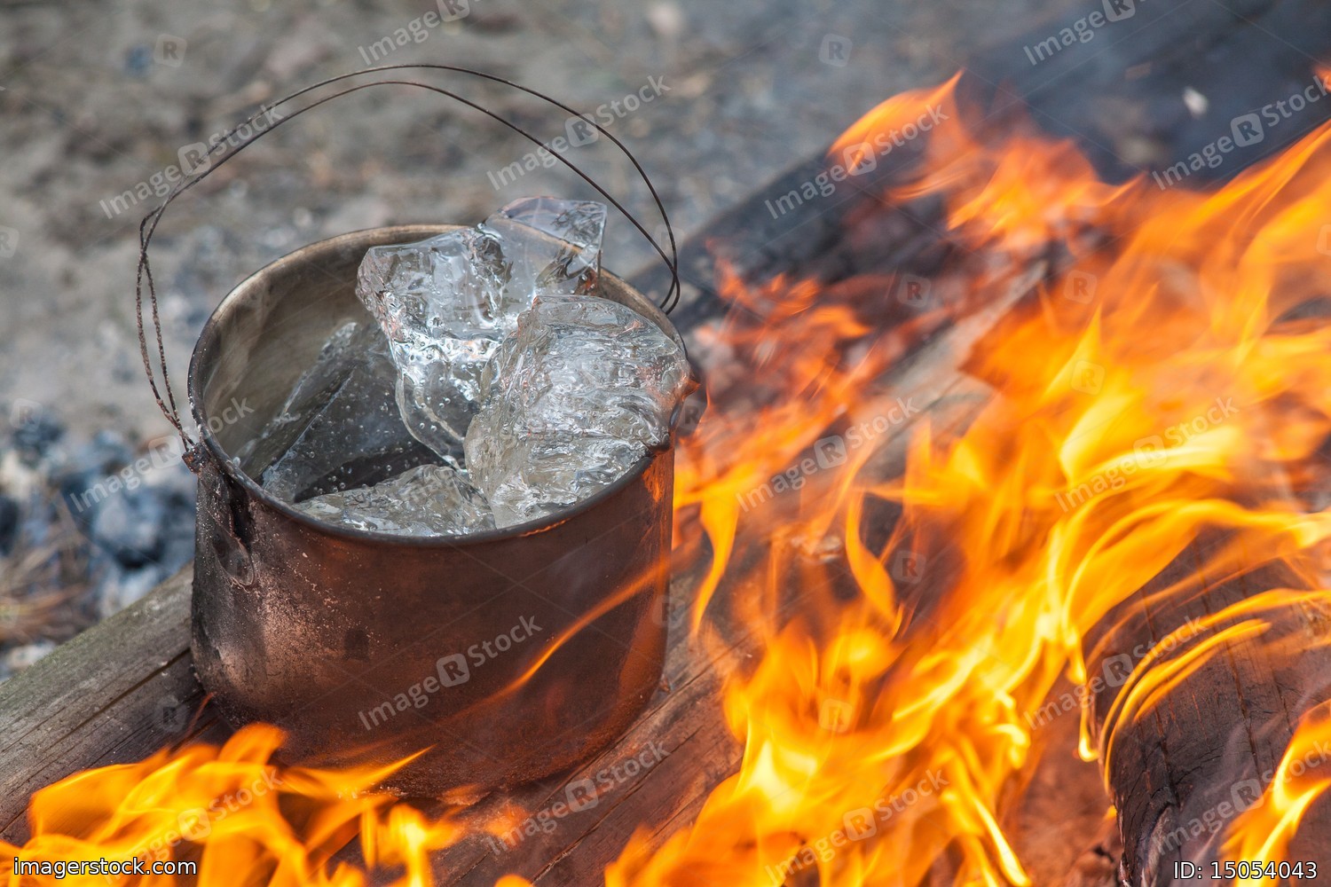 Cooking in the nature. Cauldron with ice on fire in forest.