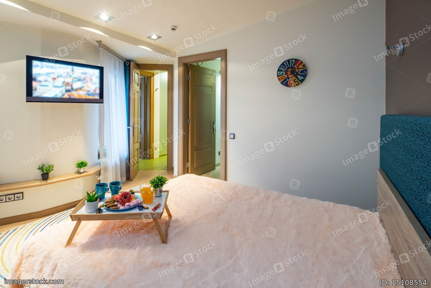 Interior of bedroom. Modern apartment. King-size bed. Tray with food.