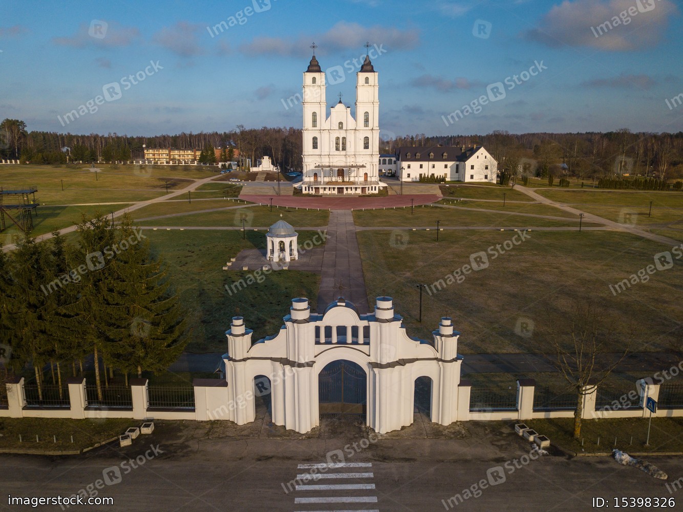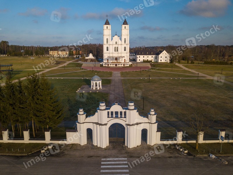 View from above of Aglona Roman Catholic Basilica of the Assumption of the Blessed Virgin Mary. Latvian landmark. Beautiful forest.