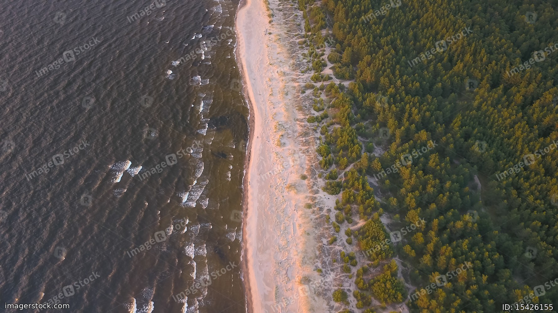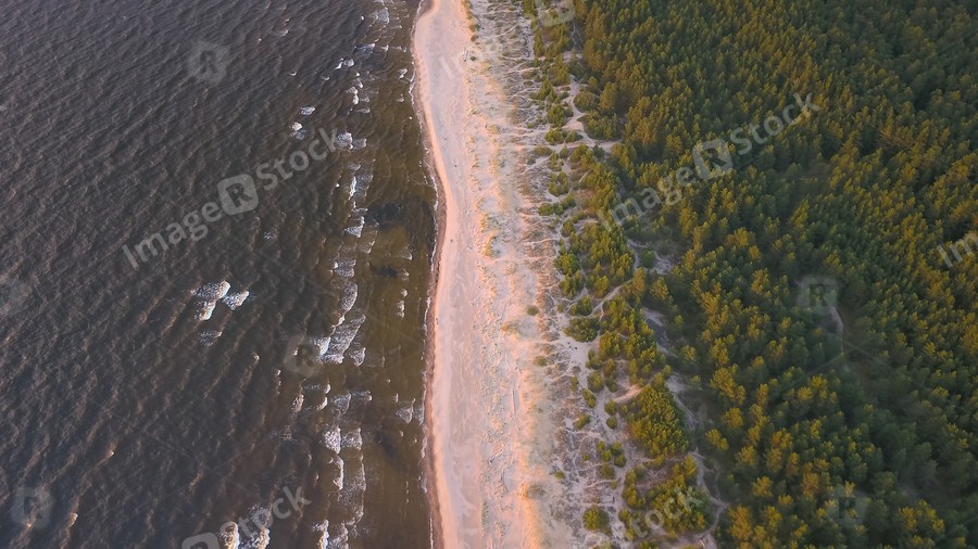 Beach on the sea, top view. Aero photographing a sea beach at sunset.