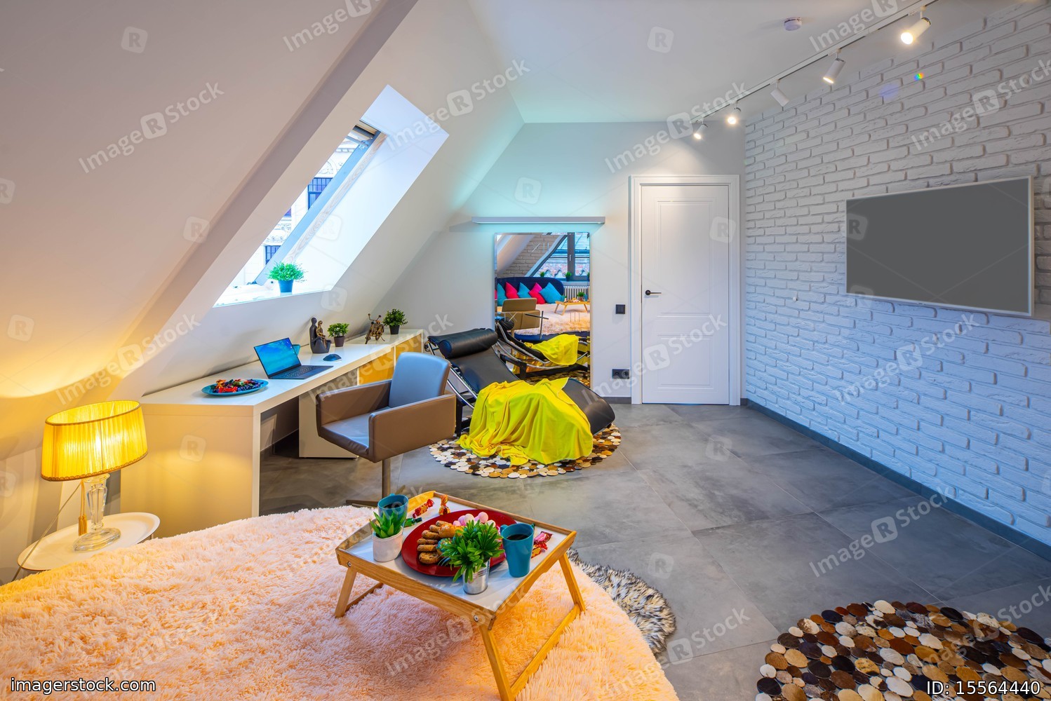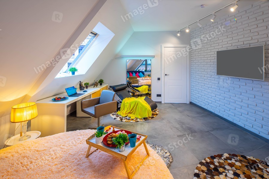 Loft interior of modern apartment. Roof window. Place to work. Lounge chair. TV on the brick wall. Huge mirror. Food on tray.