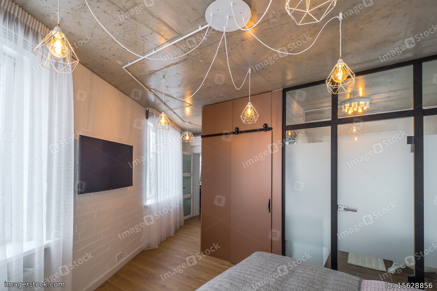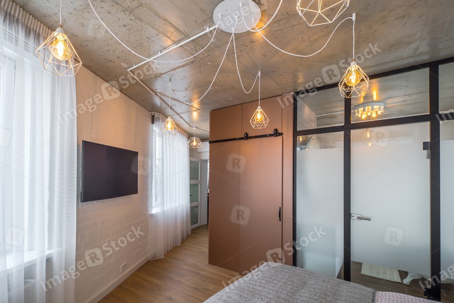 Interior bedroom in the apartment. Concrete ceilings, wooden floor.