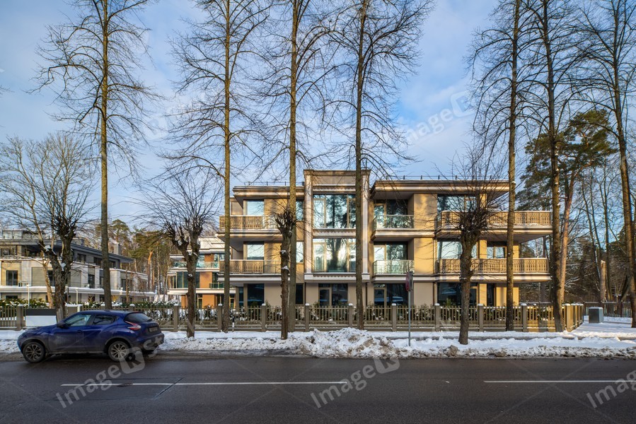 Modern exterior of new luxury residential building at winter.