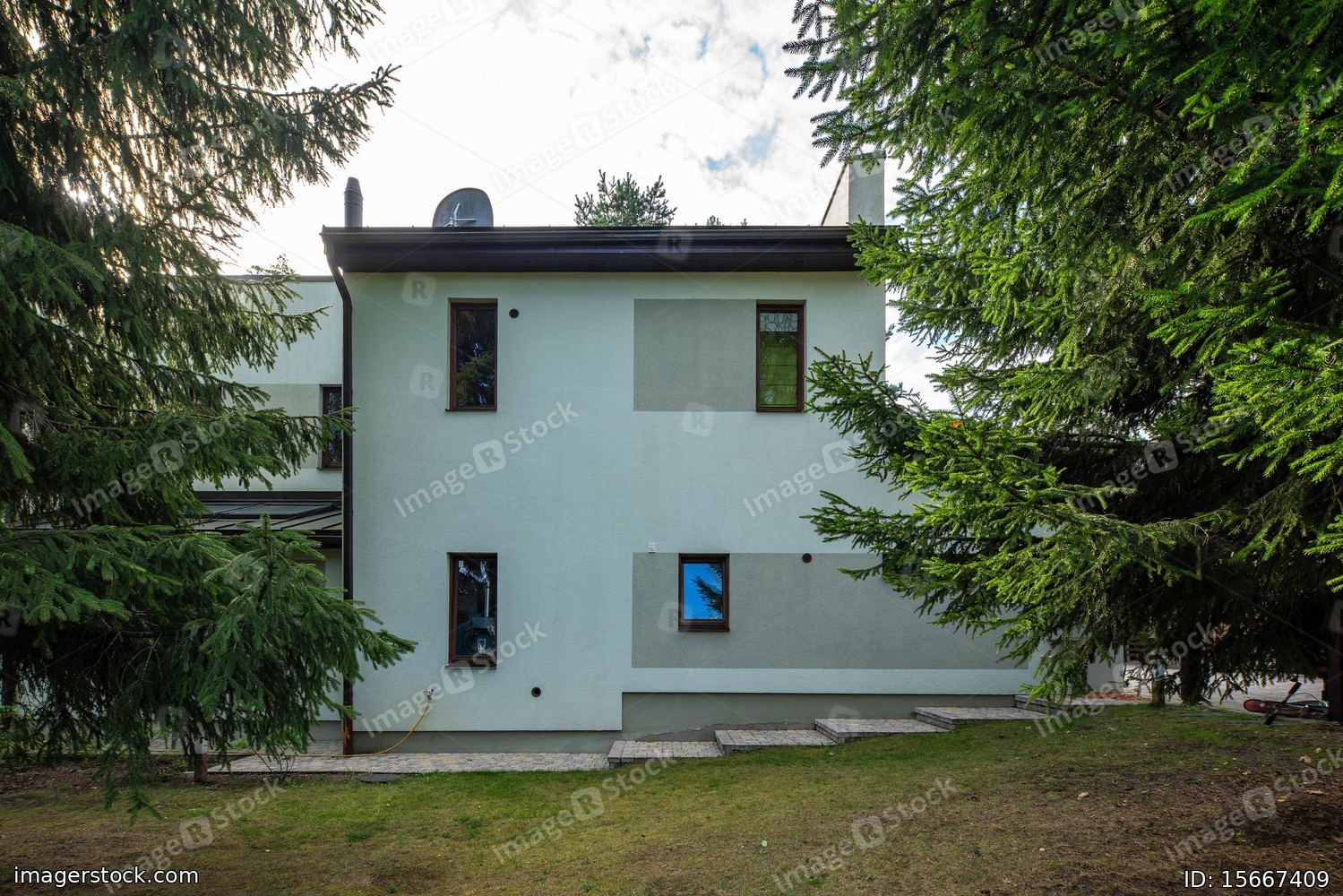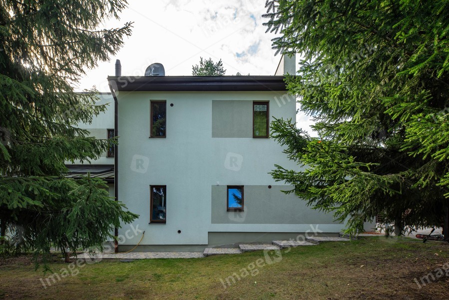 Private house between trees. Modern light exterior. Wall with windows. Summer cloudy day.