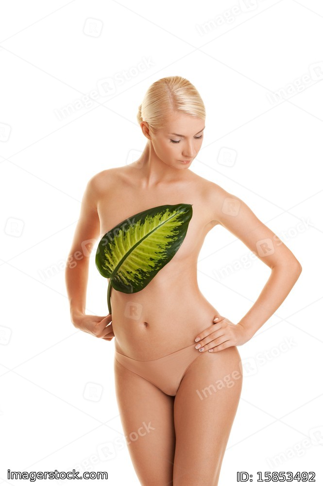 Beautiful young woman with exotic green leaf. Isolated on white