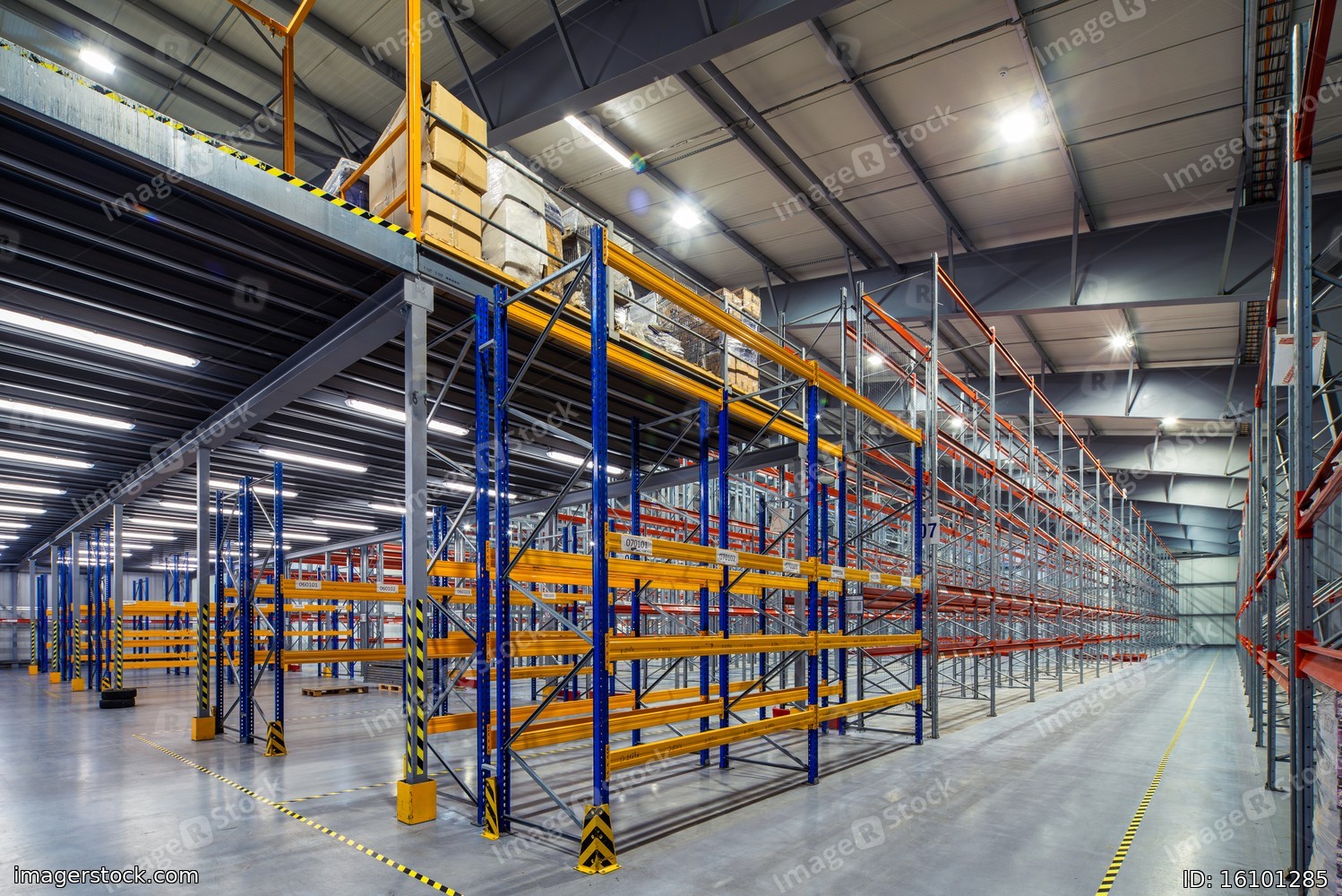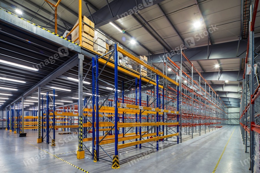 Interior of huge empty storehouse. Industrial warehouse racking.