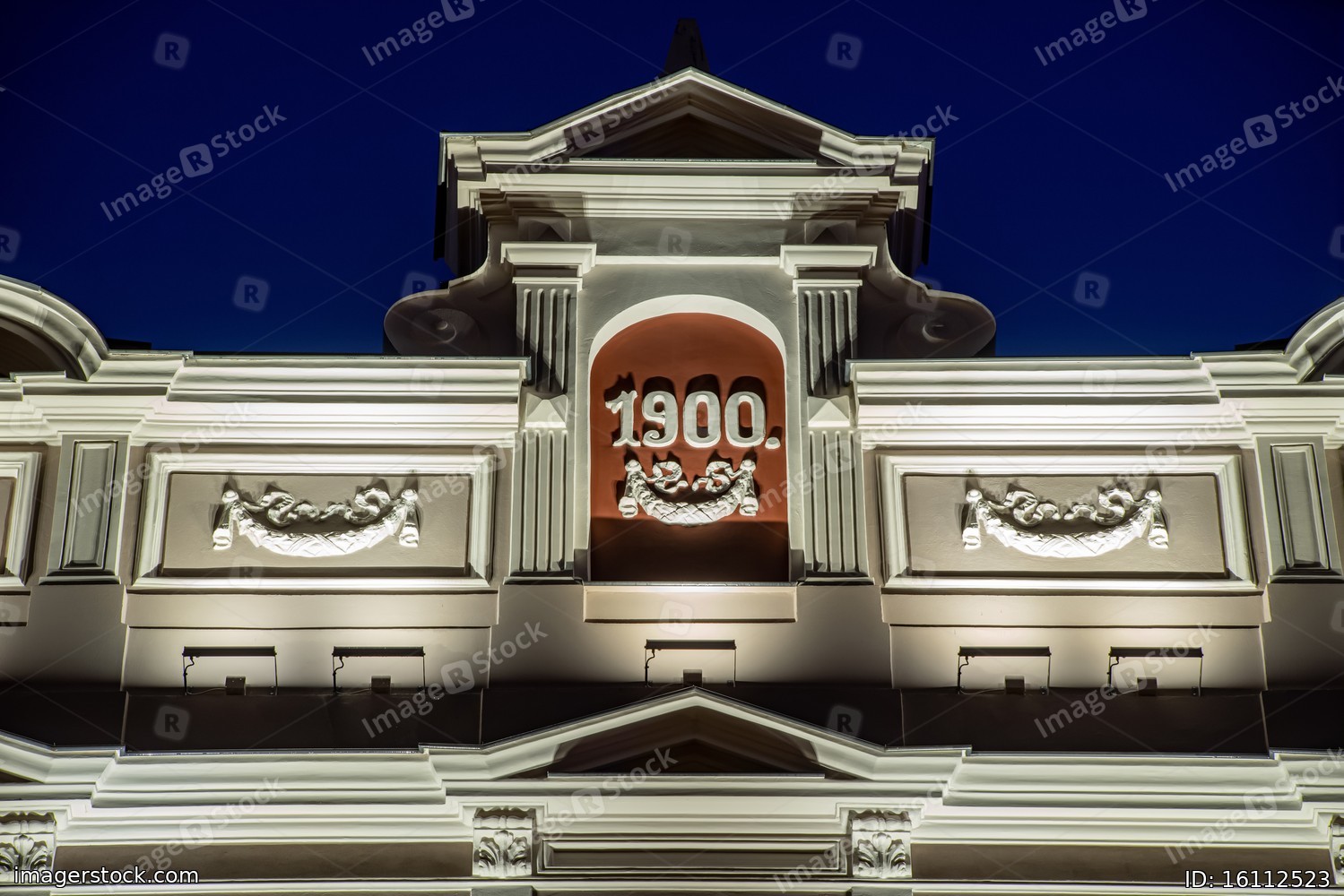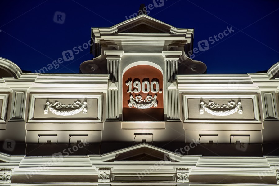 Modern illuminated residential building. Detail of exterior.