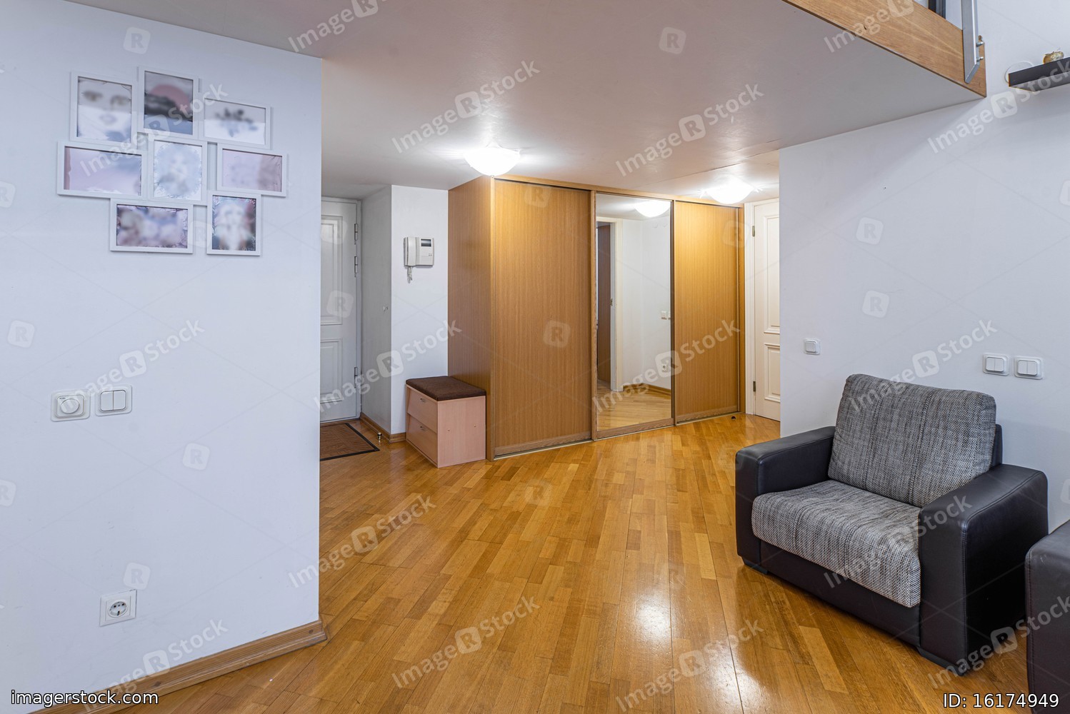 Entrance hall in private house. Grey chair. Wardrobe with mirror.