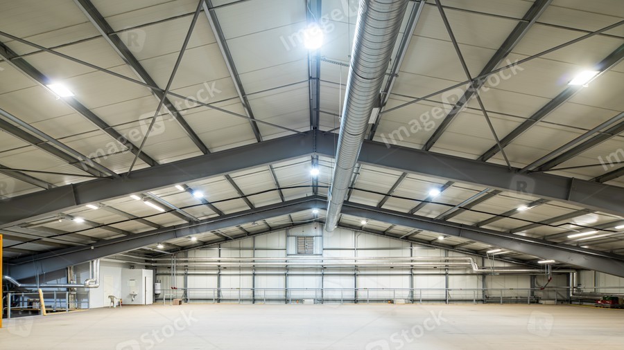 Interior of huge empty storehouse. Industrial warehouse racking.