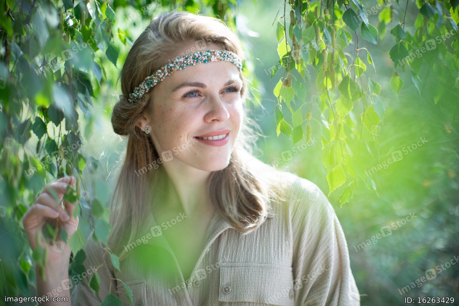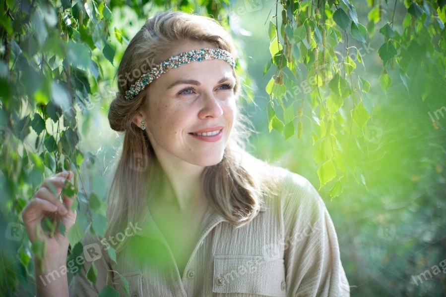 Beautiful woman. Green leaves. Portrait.