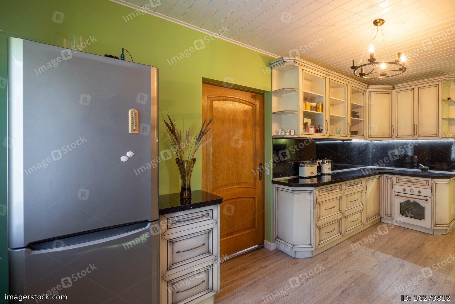 Modern interior of kitchen in private country house. White kitchen set. Green wall. Wooden door. Fridge.
