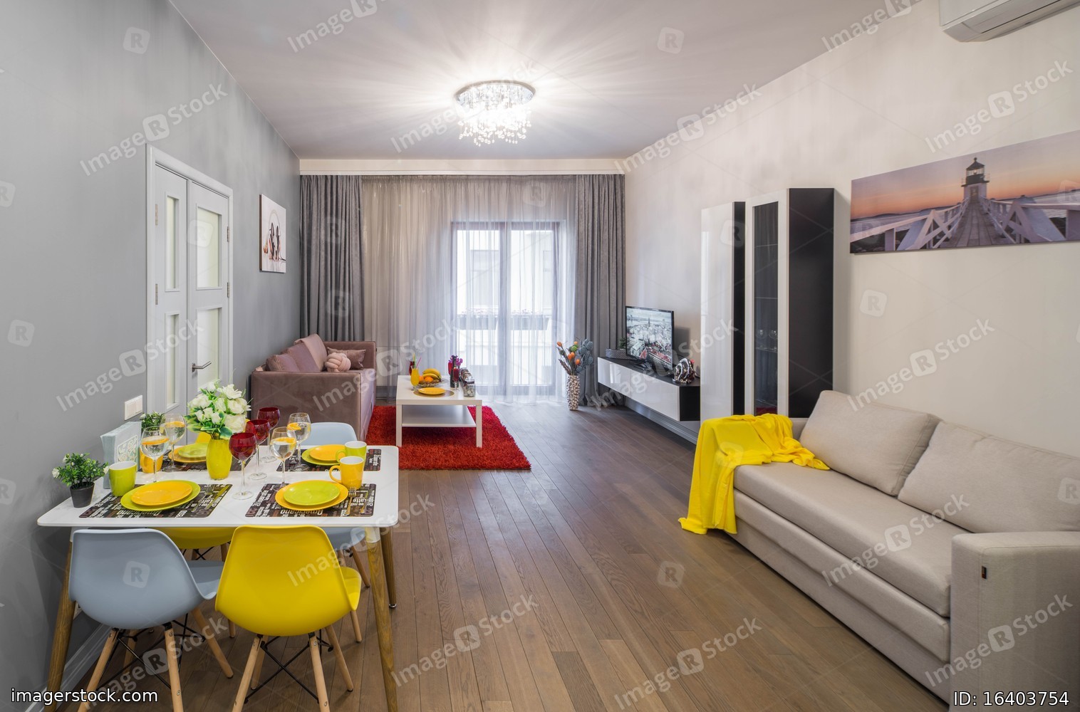 Modern interior of living room in studio apartment. Furniture and tv.